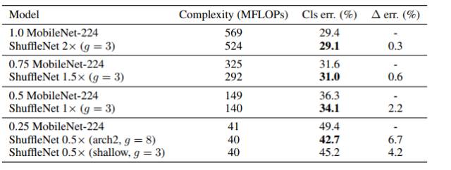 最近Howard et al. 提出了MobileNets [4],利用[1]里的逐通道卷积的设计移动设备上高效的网络结构。虽然ShuffleNet是为了小于150MFLOPs的模型设计的,在增大到MobileNet的500~600MFLOPs量级,依然优于MobileNet。而在40MFLOPs量级,ShuffleNet比MobileNet错误率低6.7%。详细结果可以从表3中得到。