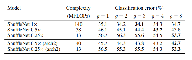 作者对于计算复杂度为140MFLOPs 、 40MFLOPs、13MFLOPs的ShuffleNet模型,在控制模型复杂度的同时对比了分组化逐点卷积的组数在1~8时分别对于性能的影响。从表1中可以看出,带有分组的(g>1)的网络的始终比不带分组(g=1)的网络的错误率低。作者观察到对于较小的网络(如ShuffleNet 0.25x),较大的分组会得到更好结果,认为更宽的通道对于小网络尤其重要。受这点启发,作者移除了网络第三阶段的两个结构单元,将节省下来的运算量用来增加网络宽度后,网络性能进一步提高。