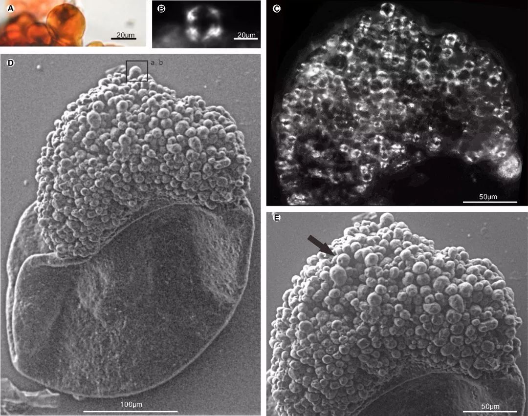 研究人员认为,这些位于大孢子近极面的淀粉团块,与现生一些种子上常出现的一种被称为油质体的可食附着体非常接近,主要用来吸引动物食取种子,从而实现种子的远距离传播。