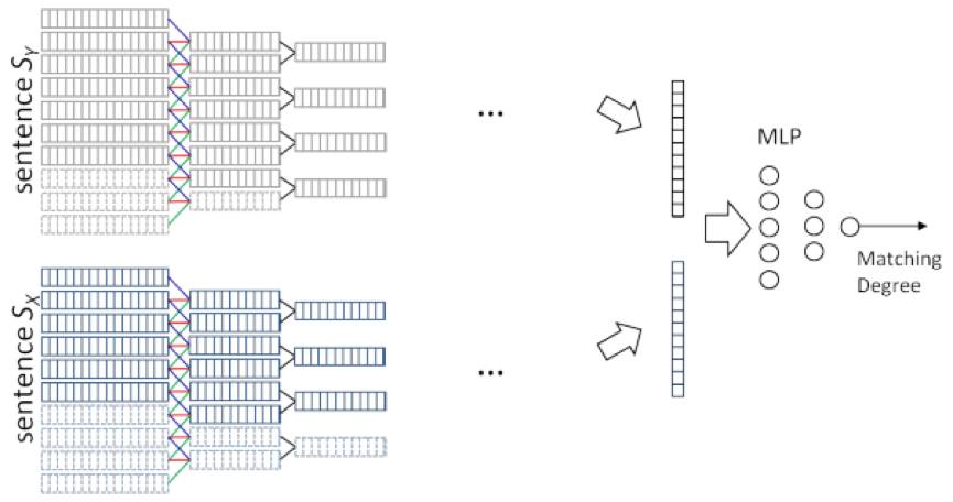 上图所示的 ARC-II 在第 1 层卷积后就把文本 X 和 Y 做了融合,具体的融合方式是,分别对 X 和 Y 做 1D 卷积,然后针对两者卷积得到的 feature maps,构造其所有可能的组合(在两个方向上拼接对应的 feature map),这样就构造出一个 2D 的 feature map,然后对其做 2D MAX POOLING,多次 2D 卷积和池化操作后,输出固定维度的向量,接着输入 MLP 层,最终得到文本相似度分数。