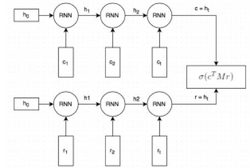 该模型思路直观:通过对偶的 RNN 模型分别把 context 和 response 编码成语义向量,然后通过 M 矩阵变换计算语义相似度,相似度得分作为监督信号在标注数据集上训练模型。