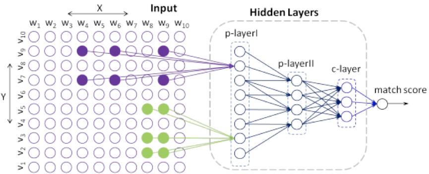 作者认为 ARC-I 的监督信号在最后的输出层才出现,在这之前,X 和 Y 的隐语义向量相互独立生成,可能会丢失语义相关信息,于是提出 ARC-II 架构。