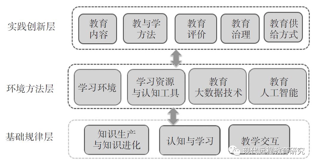 需要指出的是,基础规律层、环境方法层与实践创新层,并非相互独立、毫无关联的三个独立层次,而是相互关联、相互促进的有机整体。其中基础规律是整个问题域框架的出发点和归宿,所有研究均是围绕基础规律进行开展,并最终回归到深层次的规律认识和应用;环境方法层是整个问题域框架中的支撑层,具有上下承接的作用,实现将基础规律的发现转变为实践应用,并同时将实践应用的结果反馈给基础规律的探究;实践创新层是教育研究问题域落地应用的抓手,是检验基础规律的唯一途径和标准,是整个问题域框架的关键。