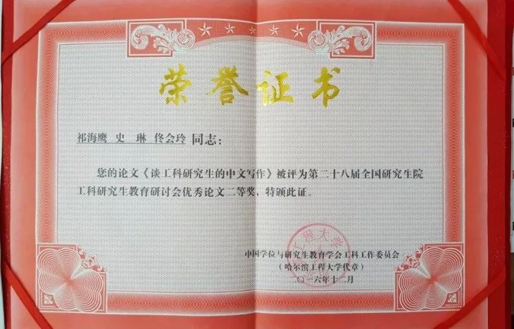 在授课实践的同时,课程积极探索工科中文写作的教学规律,研究成果在2016年12月第28届全国研究生院工科研究生教育研讨会上发表,获“优秀论文”二等奖(图5)。