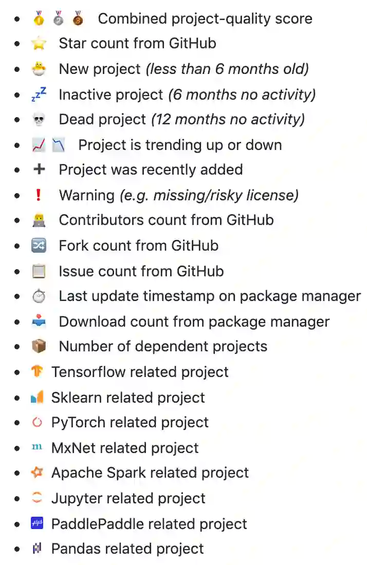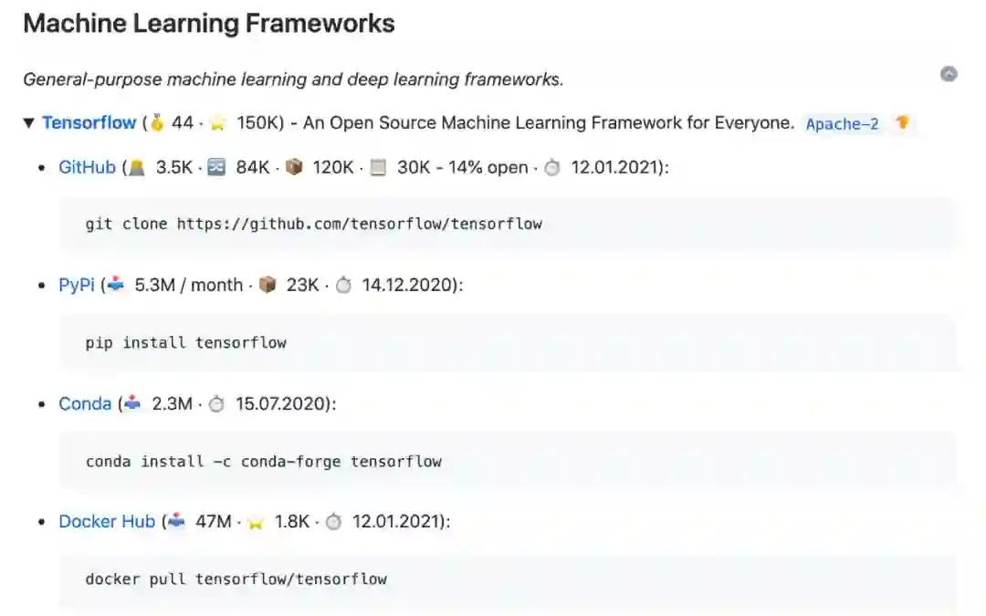 纵观所有分类,我们可以发现这些项目囊括了从框架、数据资源、数据处理流程到实验跟踪的整个流程,AutoML、强化学习、推荐系统等人工智能分支领域,以及 GPU、Tensorflow、Sklearn、Pytorch 实用程序。