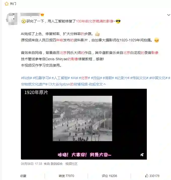 昨天,一条“100 年前北京晚清的影像”喜提热搜,博主用 AI 技术修复了一段 10 多分钟的古董视频,使得 100 多年前老旧的黑白影像变得更加清晰,甚至有了颜色。