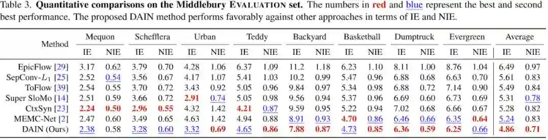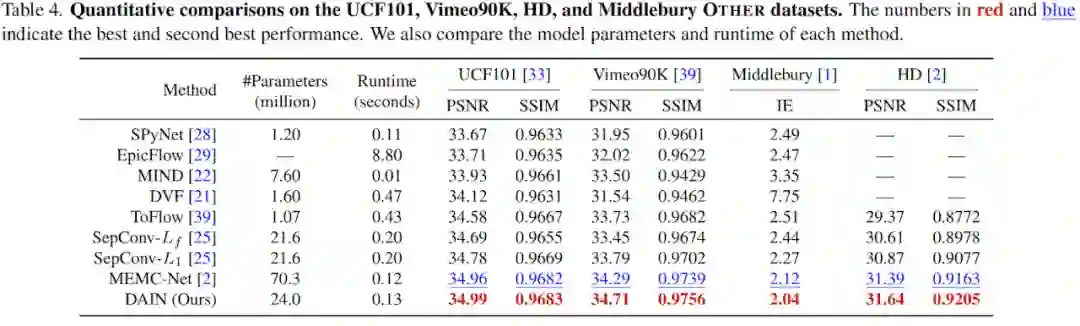 这种模型紧凑、高效且完全可微分。定量和定性的结果表明,DAIN 在各种数据集上均优于最新的帧插值方法。