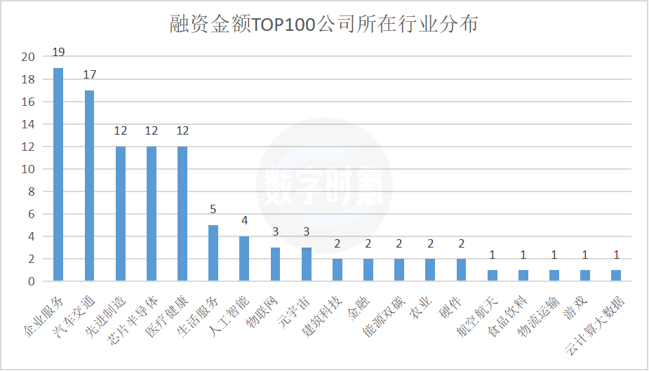 从融资金额TOP100企业来看,企业服务、汽车交通、医疗健康、芯片半导体、先进制造项目数量比例处于前列,分别为19、17、12、12、12项,反映了资金的流向主要集中在硬科技、技术驱动型的项目中。