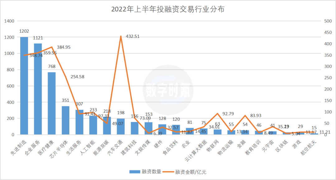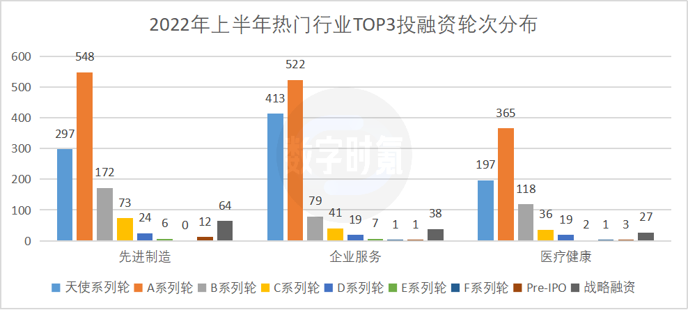 先进制造、企业服务、医疗健康是2022年上半年的投资热点TOP3,融资数量占比共达到56.8%;