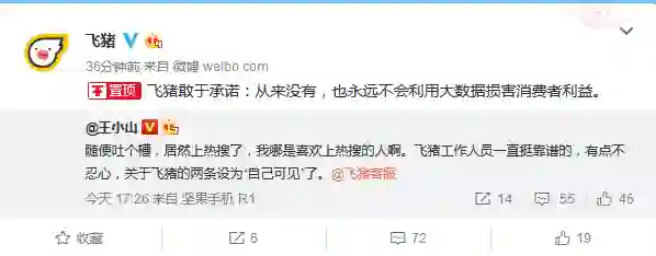 针对知名作家王小山炮轰飞猪旅行 App 利用大数据杀熟一事,飞猪官方微博回应称,“飞猪敢于承诺:从来没有,也永远不会利用大数据损害消费者利益。”