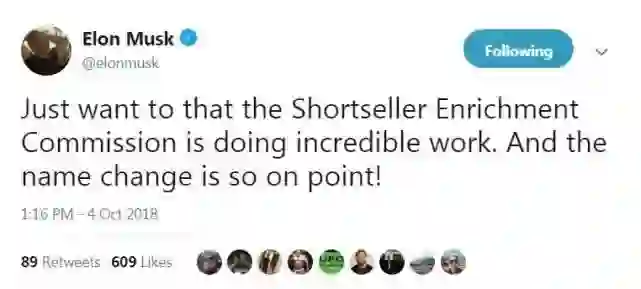 “就是想知道喂肥空头的委员会(推特原文为‘the Shortseller Enrichment Commission’,缩写 SEC 和美国证券交易委员会的缩写 SEC 一样,编者注)正在做不可思议的工作。这名改得精妙!”
