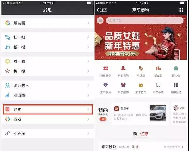比如说,腾讯一直在不遗余力地整合京东在微信发现频道中的“购物”入口内的多项资源,目的就是为了扩大微信的电商渠道,以期带来更多的用户流量。