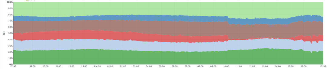 上图为 Cloudflare 网络与所对接的各网络服务供应商之间的六条核心一级主干网络之间的流量。红色部分代表 CenturyLink/Level (3) 流量,该流量在故障期间降至接近于零。