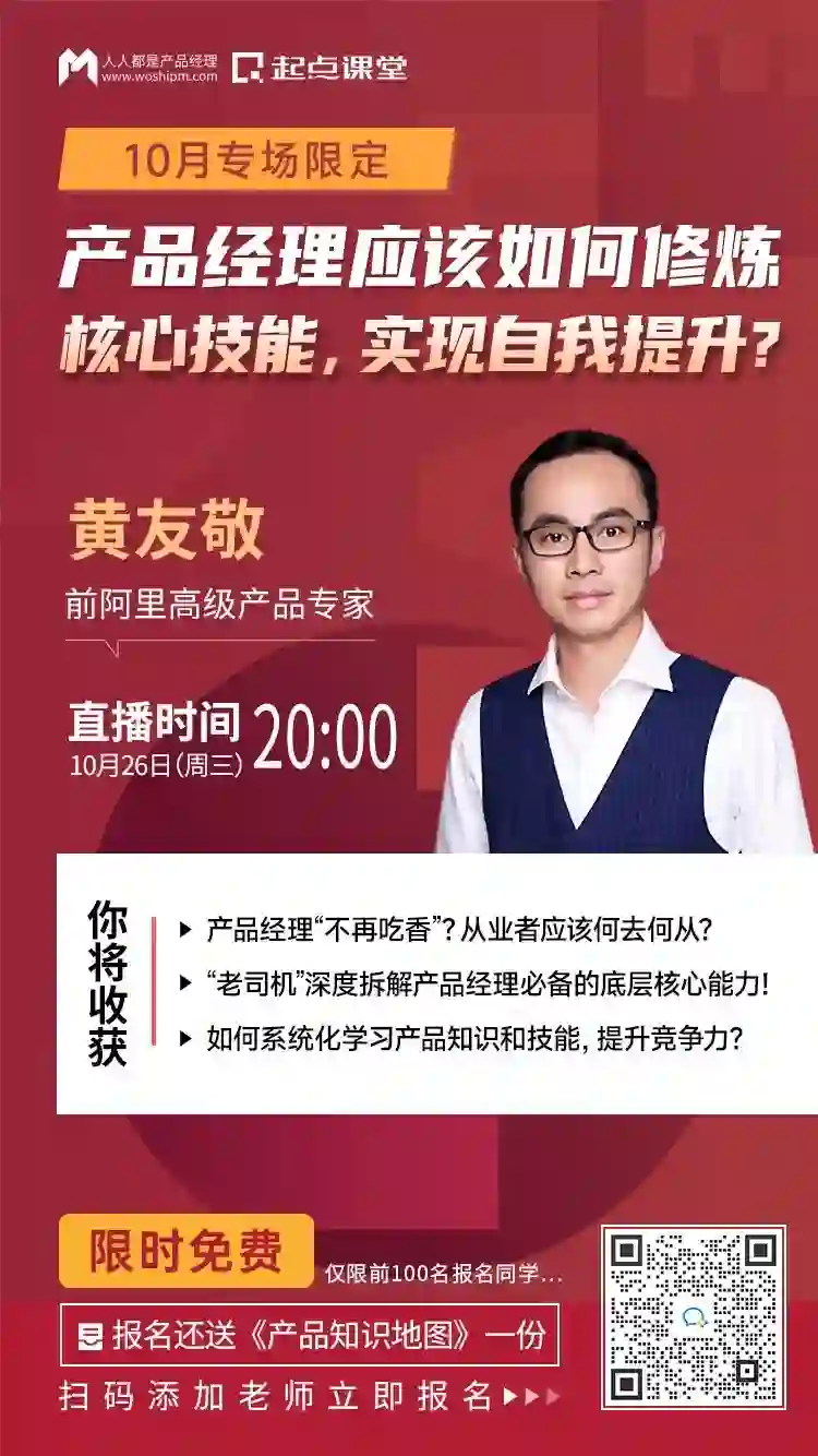 为了帮助大家解决产品核心技能不足的问题,我们特邀前阿里高级产品专家@黄友敬老师在线直播。