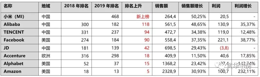 中国的IT公司和主要科技公司还在快速的增长,排名上升,阿里巴巴排名增长了118名,腾讯增长了94名,非常惊人。