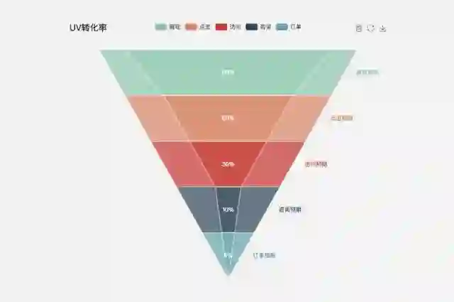 流程型结构的内容一般会出现多个环节,每个环节之间都会有相应的内容,按照一定的流程逐步细化,深入引导用户阅读。符合这种结构,如市场销售各环节流程,像这种垂直的流程型内容结构,很容易让用户清楚每个环节的数据变动,定位哪个环节出了问题。这种结构有个较为典型的统计模型是:漏斗。