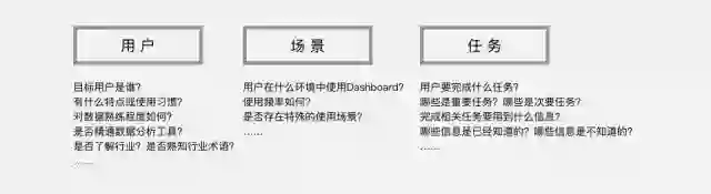 如上图,了解用户对数据和行业的熟悉程度等,可以辅助判断提供与用户水平相匹配的数据分析能力。同时,也可以从中判断是否需要嵌入内容注释和辅助信息等,帮助用户理解。而在场景和任务中,用户行为本身就受场景影响,设计Dashboard时要考虑不同场景下具体任务的合理性和重要程度,在后续处理内容时辅助判断优先级。