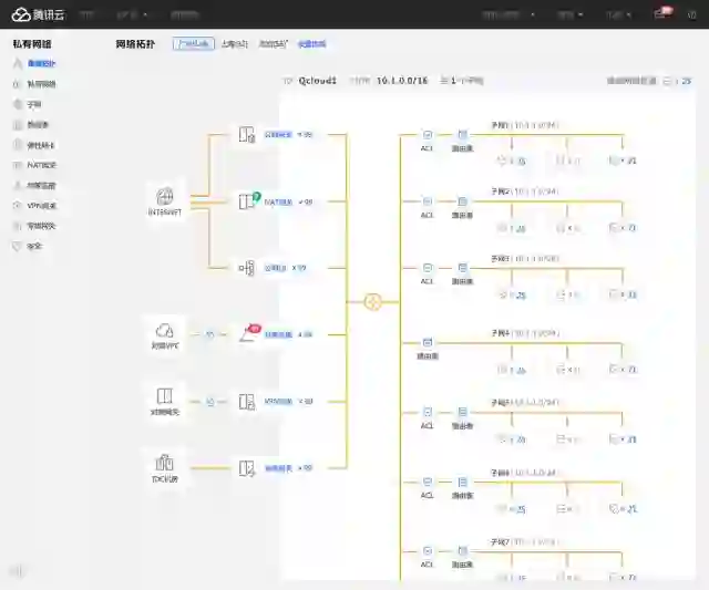 内容相互之间具有一定的逻辑关系,如地理位置关系、数字包含关系、对象父子关系等,这种结构可以让对象之间的逻辑关系十分直观。如腾讯云VPC网络拓扑,将资源对象的位置和关系抽象表示,很直观的呈现了资源对象之间的相互关系。