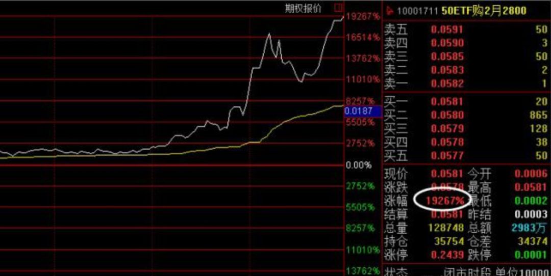 2019年2月25日,上证50ETF购2月2800合约暴涨19267%,及一天暴涨192倍,上演了一场一夜暴富的现实美梦。