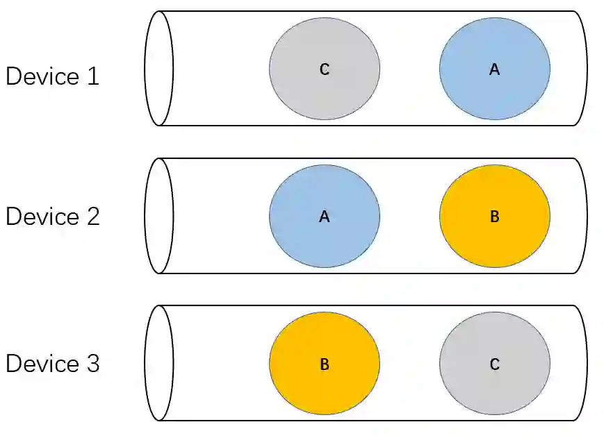 上图展示了另外一种产生死锁的情形(经典的哲学家用餐问题),设备 1 和 2 需要做集群通信 A,设备 2 和设备 3 需要做集群通信 B, 设备 3 需要和设备 1 做集群通信 C,如果各个设备队列以上图所示的顺序发射 kernels,那么也会陷入死锁。