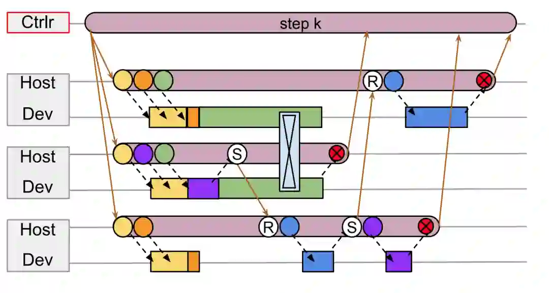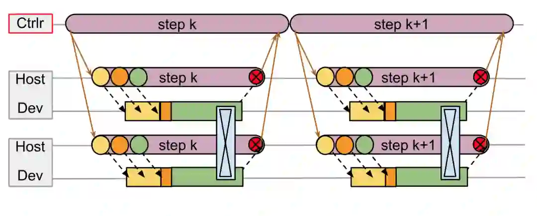 注意,这里没有中心调度器,每个 Host 都按照相同顺序向各自管理的 Device 队列上发射计算任务即可,多个 Device 在相同的时间点发起集群通信,一旦完成集群通信就可以继续执行各自队列里的计算任务。可见,每个设备的执行队列里都排满了计算任务,不会出现 TF v1 里那么多空闲时间片。在这个架构里,设备之间的集群通信是通过特殊网络连接完成的,Host 和 Device 之间的消息通过 PCIe 来完成,不会承受 TF v1 中心 controller 和 worker 通过以太网通信所产生的高延迟。