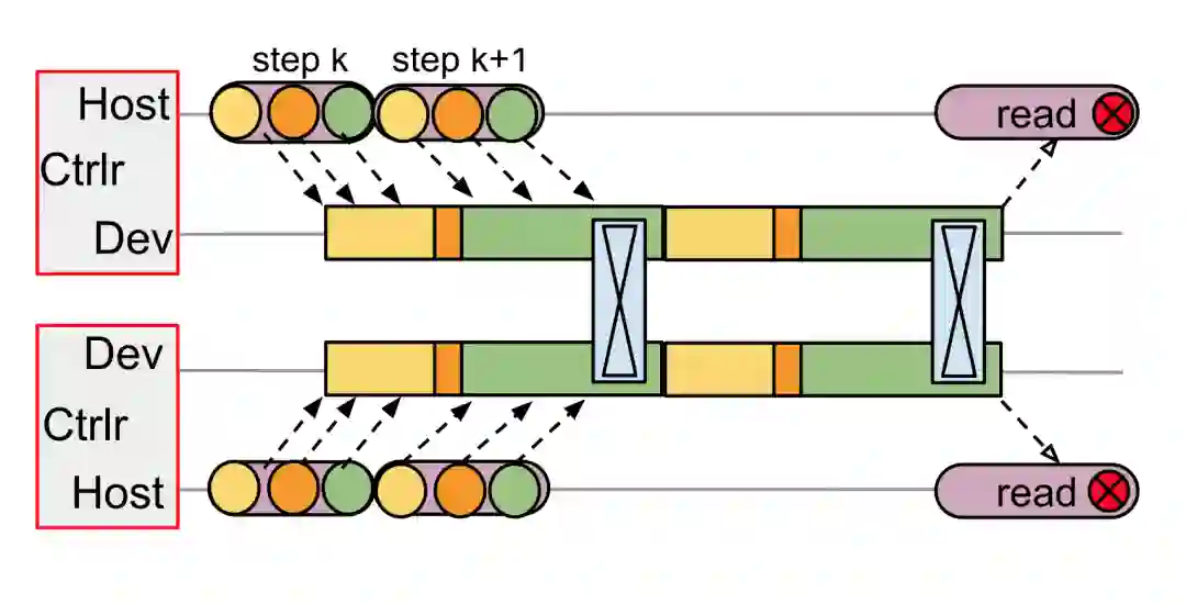 显而易见,在上图所示的TF v1方案中,由于发送消息存在延迟,虽然 controller 上两个相邻的步骤是紧密排列在一起,但两个 worker上的 device 上都出现了大段的空闲(idle),设备利用率无法饱和。这是一个显而易见的问题,想不通为什么 TensorFlow 开头这么设计。