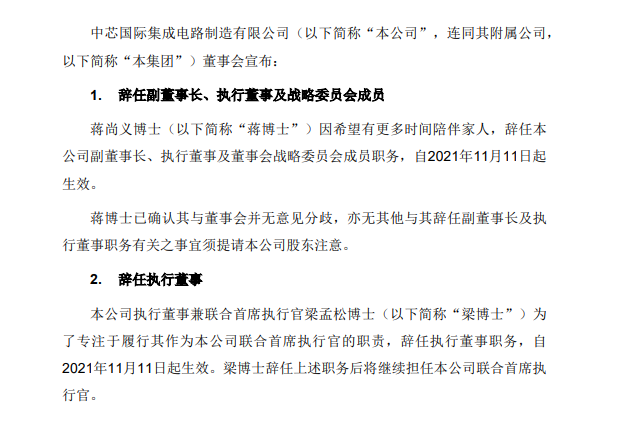 另外,中芯国际发布公告宣布了几个重要的人事变动,其中:蒋尚义辞任公司副董事长、执行董事及董事会战略委员会成员职务,自 2021 年 11 月 11 日起生效;梁孟松辞任执行董事职务,自 2021年11 月 11 日起生效,辞任上述职务后将继续担任本公司联合首席执行官。