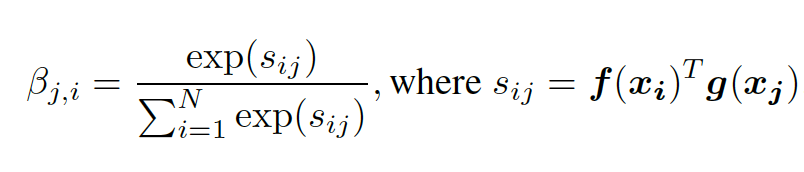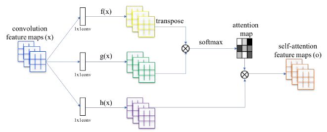 然后,注意力图与 h(x) 的值相乘来生成自注意力特征图,如下所示(Zhang 等,2018):