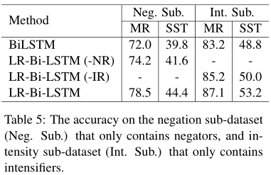 为了进一步研究NR和IR的作用,作者在又分别在仅包含否定词的子数据集(Neg.Sub)和仅包含程度副词的子数据集(Int.Sub)上做了对比实验,实验结果如下图,