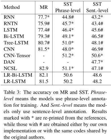 本文的LR-LSTM和LR-BI-LSTM和Tree-LSTM的结果基本持平,但是本文的模型更简单,效率更高,同时省去了短语级的标注工作。