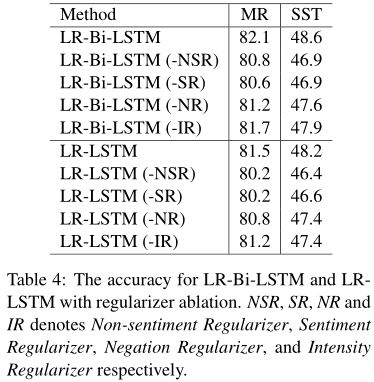Linguistically Regularized LSTM是把语言学规则(包括情感词典、否定词和程度副词)以约束的形式和LSTM结合起来。作者定义了四种规则来将语言学知识结合进来,每一个规则主要是考虑当前词和它相邻位置词的情感分布来定义的。