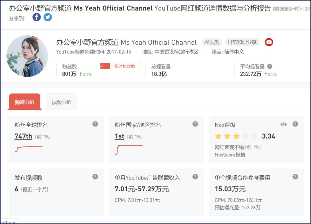 办公室小野在YouTube上的各项数据,收入单位为美元(数字来自海外网红营销平台Nox Influencer)
