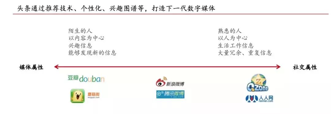 但让张一鸣可能没想到的是,他当年想表达的意思很可能是头条能成为位于箭头中段的新浪微博&腾讯微博,但上述箭头模型在后来很多年的不断衍化里,今日头条App由于体量大、分发内容广但平台关系弱,渐渐成为了大家最爱举例的处于最左端的纯信息分发型产品。