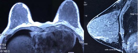 患者入院后查体:双侧乳房对称,双侧乳头无内陷,无异常分泌物,表面皮肤无红肿,右侧乳腺外下象限可触及一3cm×3cm大小包块(约7点方向,距乳头约5cm),无压痛,质地硬,边界不清,活动度差,与胸壁粘连固定,右侧腋窝可触及肿大淋巴结,左侧乳腺及左腋下未触及异常。相关影像学和实验室检查示:①乳腺超声:右侧乳腺8点方向距乳头约5cm可见大小约2.9cm×1.6cm×2.5cm低回声,边缘不清,形态不规则,内可见丰富血流信号,BI-RADS 4类。右侧腋窝可见肿大淋巴结,皮髓质界限不清。②乳腺MRI(图1)示:右乳外下象限胸壁前方见一个不规则团块状稍长T2信号,周围环绕片状长T2信号,TIC呈流出型,大小约2.6 cm×2.6 cm×2.9cm,BI-RADS 4类,肿块后缘与右侧胸壁界限不清。③超声心动示:左房、左室大,左室舒张、收缩功能减低,二尖瓣返流(中-重度),双平面法估测EF:32%。④脑利钠肽(brain natriuretic peptide,BNP)2132pg/L。④余胸部CT、腹部B超、骨扫描、血肿瘤标志物等检查未见明显异常。
