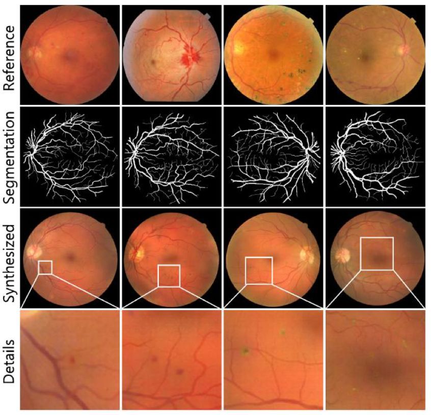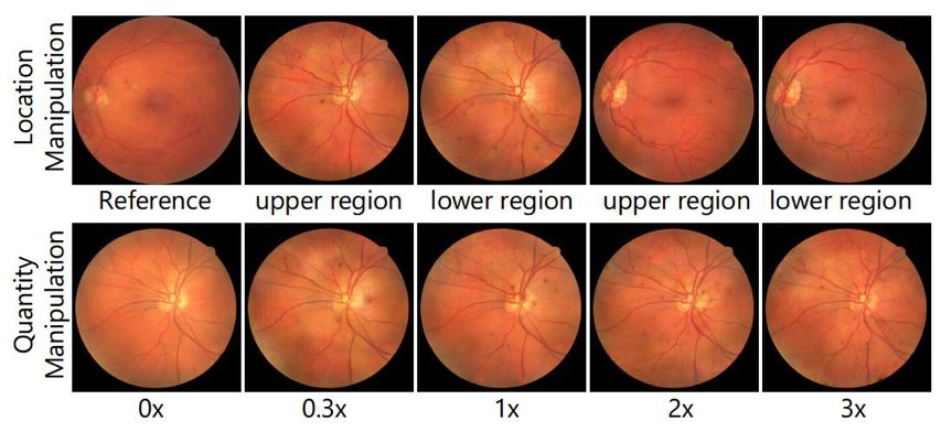 本文使用一种基于 GAN 的方法来将病理描述符可视化,合成带有特定病变的眼底图,且病变合成的方法具有一定的可操控性。合成的结果得到了医生的认可。