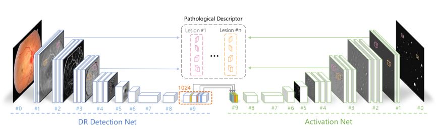 Kaggle 于 2016 年举行了 DR 眼底图检测的竞赛。本文使用的冠军算法中的一种:o_O(Antony 2016)。仿造 Zeiler 和 Fergus 的 CNN 可视化方法,我们在检测器后接上了一个激活网络,用对称的结构来还原每个卷积层中被激活的神经元。