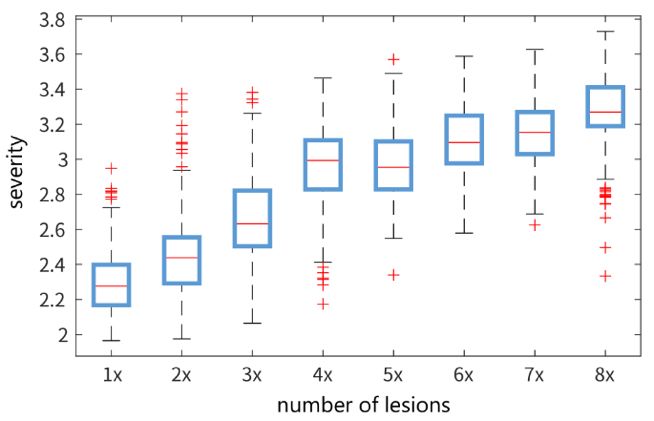 图 8:病变数量增加时,DR 检测器给出的严重程度也会相应提升