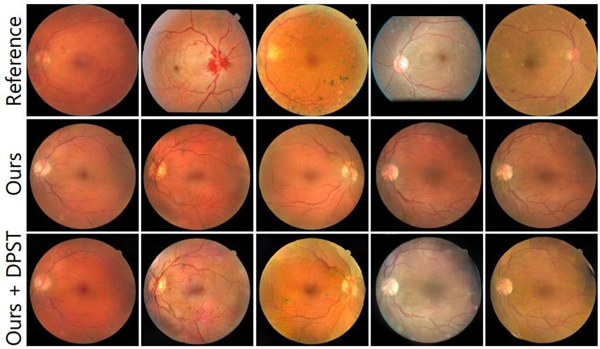 在测试阶段,文章使用了 DRIVE 数据集 (Staal et al. 2004) 作为正常眼底图,使用 STARE (Hoover, Kouznetsova, and Goldbaum 2000) 和 Kaggle 中的图像作为病变参考图,进行了多组实验。