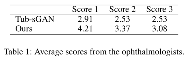 为了进一步说明合成结果的先进性,我们将本文方法与 Zhao 等人的 Tub-sGAN 生成的图片随机混合,并组织了 5 位专业的眼科医生,对其进行双盲评测。对于每幅合成图像,医生为其进行三个评分:1. 眼底图的真实性,2. 合成病变的真实性,3. DR 的严重程度(评分范围是 1-10,得分越高越好)。最后收集到对 560 组评分,其平均值如表 1 所示。本文方法在合成的真实性上有明显优势。
