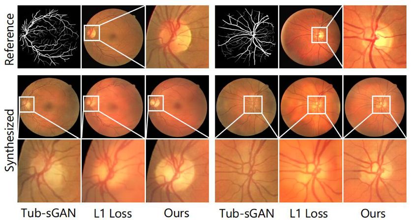 本文的生理细节 Loss,选用 VGG 来进行高层特征的计算,而非直接使用 L1 Loss,能够正确的保留视盘边界等生理细节。与 Zhao 等人的 Tub-sGAN 不同,本文的病理 Loss 作用在病变局部,不会影响生理细节的正常合成(图 9)。