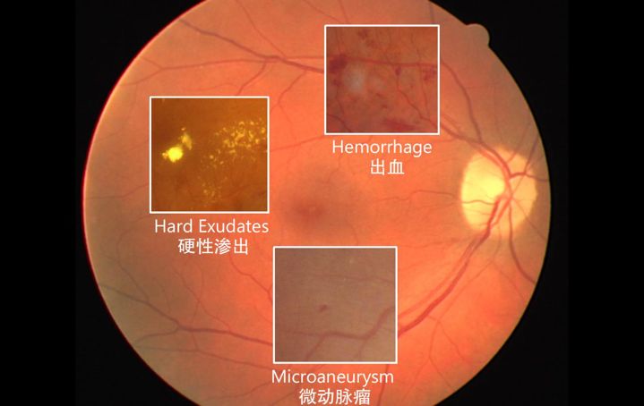 本文以糖尿病视网膜病变(Diabetic Retinopathy,简称 DR)为例。全球范围内,有超过 4 亿糖尿病患者。根据 2016 年美国的统计,约有 40%-45% 的患者会发展出 DR 的症状。这种病变通常根据视网膜眼底图来进行诊断。DR 患者的眼底图上会出现不同程度的微动脉瘤、出血、渗出等病变。