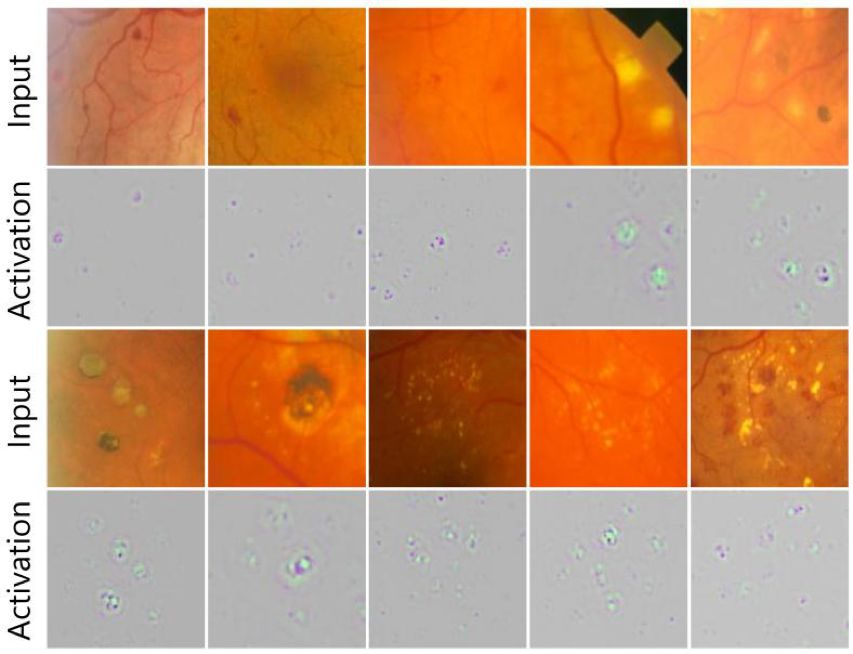 图 4 将输入的眼底病变图和输出的激活图进行放大对比。输入的病变图经过一层层卷积,保留了病理特征,丢弃了血管等正常生理特征。由结果对病变的选择性,可以窥见 CNN 做出决策的证据。虽然在训练 CNN 检测器时仅仅使用了「病变图-严重程度」这样的图像级别标注,它仍能学到各种病变的特征,并且主动关注这些区域。