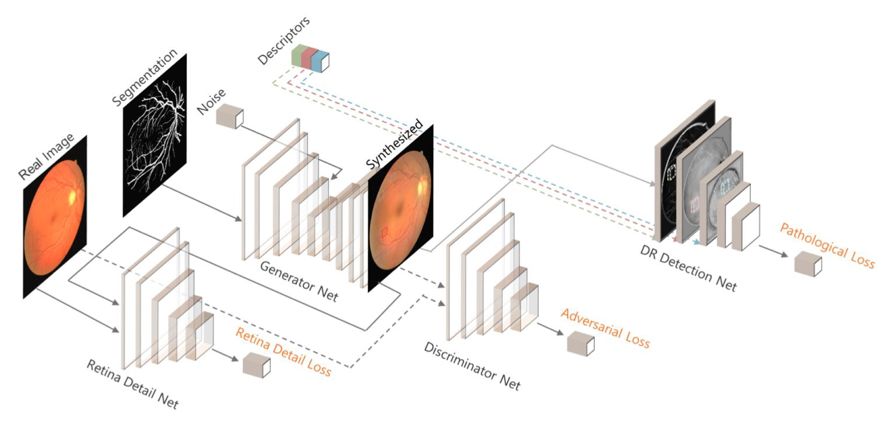 DR 检测子网络用来计算最重要的「病理 Loss」,使合成的眼底图中出现病变。