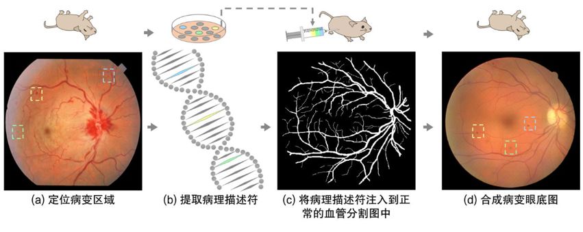 具体来说,本文首先在经典 CNN 病变检测算法中提取病理描述符,并利用一种 CNN 的可视化方法来定位病变(图 1.a);模仿科赫法则中在无数微生物中分离病原体这一过程,本方法从百万级神经元中定位到数千维直接参与疾病诊断的参数并提取出描述符(图 1.b);科赫法则接着将分离的微生物接种到健康生物体并观察产生的疾病症状,同样,本方法训练一个基于 GAN 的生成器,通过输入病理描述符中来合成眼底图(图 1.c, d),如果眼底图复现了相应的病变,就可以确认其与病理描述符的直接关系。