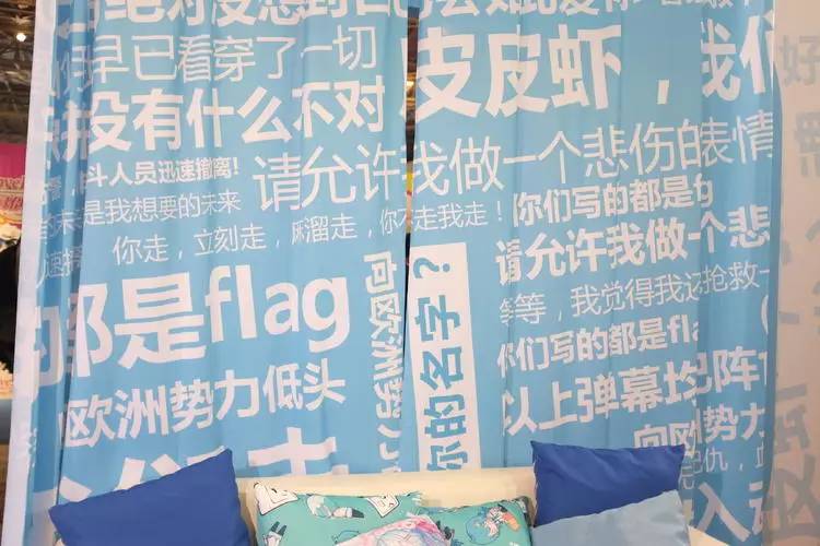 B 站很清楚的是,这些年轻人依靠兴趣交朋友,他们追求文化认同,大于追求某个周边自身的美学。所以,会场各处都装饰着圈内的「弹幕用语」,它们成了互相连接的桥梁。