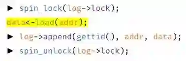 “哲学家吃中餐问题” 的 NP - 完全性 (固有的困难) 并不意味着我们无法在实际中解决它。为了实现并发程序的动态分析,必须在运行时观测并发程序的执行,而观测却并不局限于 “线程本地的记录”。我们希望有一台 “摄像机” 拍摄下哲 ♂ 学 (家吃饭) 的全过程,而修改程序的代码或运行时环境,恰好能实现这样的摄像机:为所有共享内存的读 / 写操作上锁,并在锁的保护下记录它们发生的顺序,就得到了共享内存访问的日志,如图 2 所示。从此意义上,观测并发程序执行又是容易的。