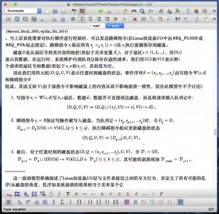 这时候,是个懒人的好处就体现出来了:我会用工具啊!之前写论文的时候总觉得 LaTeX 无论用什么工具编辑,多多少少都会干扰写作的顺畅。我总结很大的原因是文字和代码混排在一起,比如用等宽字体吧,文字读起来怪;用 Serif 吧,代码没法看。所以之前的几篇论文,我就开发了自己的 LyX 模板。期间我修正了很多不满意已有学位毕业论文模板的地方,全文 2632 个公式、40 个插图、12 个附表、144 篇参考文献,两周就搞定了,虽然提交以后到答辩前花了近一个月的时间玩命 polish……