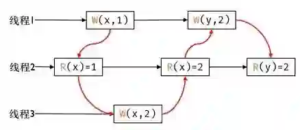 图 1:“哲学家吃中餐问题” 示意图。R/W 分别代表读 / 写事件,红色表示满足顺序一致性的线程调度