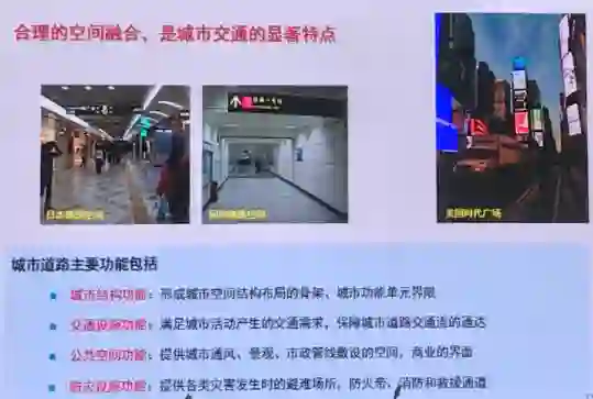 特别是在城市。很多人都喜欢国外交通枢纽的整体环境,为什么国内没有?因为国内交通枢纽因为消防考虑,把通行走廊空间净化,净化为单一的出行通道,越来越不人性化,这种处理方式违背了宜居、宜业的出发点,用附加功能替代了基本功能。城市道路主要功能主要有五个,特别是商业界别,很多把商业界别消灭了,在交通治理中,特别是在路边停车处理上,我们要增加不同使用功能,合理处理。