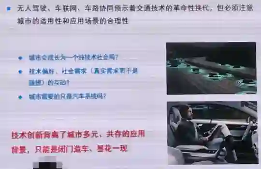 无人驾驶,在这里我强调一个观点,必须注意城市的适用性和应用场景的合理性。现在谈到的所有技术,城市只有汽车吗?还有步行,还有城市的空间,如果这些问题不解决,智能驾驶在城市里面,在公交系统中,就难以实现。技术创新如果背离了城市多元、共存的应用背景,只能是闭门造车。